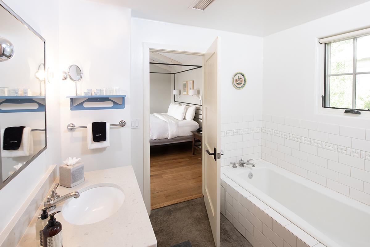 Stay in a spacious room with a steel four-poster king bed, sofa sleeper and a room design that meticulously blends a modern farmhouse and the simplicity of the WPA-era buildings that once dotted the historic ranch. Some rooms offer exclusive outdoor seating in a private patio and all open to a covered portal where you can enjoy a center courtyard with a fountain and views towards the lotus pond. The unique bathrooms offer separate showers and most have soaking tubs.