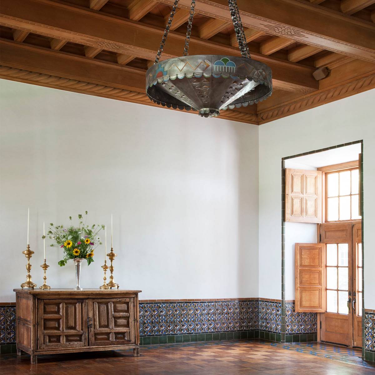 The classical styling, size and grandeur of this space, designed by John Gaw Meem in 1934, creates the perfect setting for al fresco dining. With magnificent views of the Sandia Mountains, the Grand Portal has a twenty foot deep covered portico surrounding a Portuguese tiled swimming pool with fountains. It features a true fresco painted in 1937 by Peter Hurd depicting San Ysidro, the patron saint of farmers, and a series of small mural panels of pastoral farm scenes by Harry Miller.