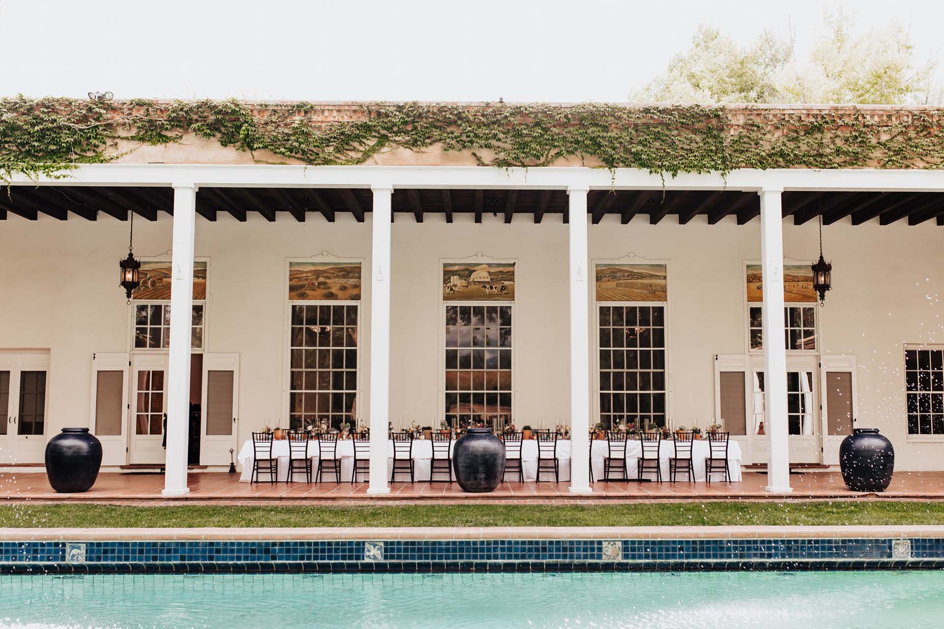 The classical styling, size and grandeur of this space, designed by John Gaw Meem in 1934, creates the perfect setting for outdoor ceremonies and dining. With magnificent views of the Sandia Mountains, the Grand Portal has a twenty foot deep covered portico surrounding a Portuguese tiled swimming pool with fountains. It features a true fresco painted in 1937 by Peter Hurd depicting San Ysidro, the patron saint of farmers, and a series of small mural panels of pastoral farm scenes by Harry Miller.