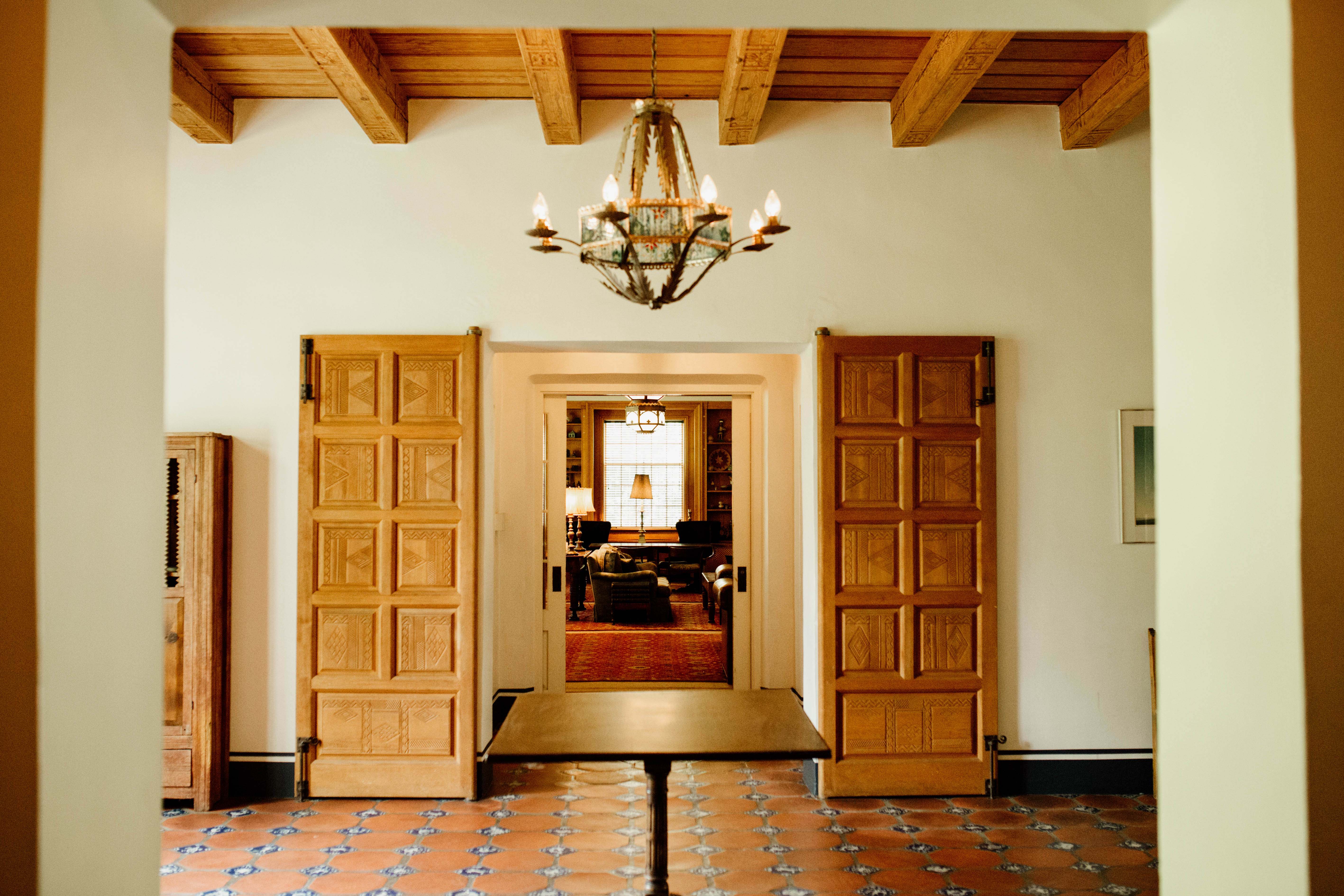 One of John Gaw Meem’s architectural masterpieces, the Grand Ballroom is undeniably one of the most stunning venues in New Mexico. The ballroom’s parquet walnut floors, elaborate carved ceilings, decorative Spanish tile and monumental fireplace make it a magnificent setting for truly memorable events. Four sets of French doors open to the surrounding gardens and the Grand Portal.