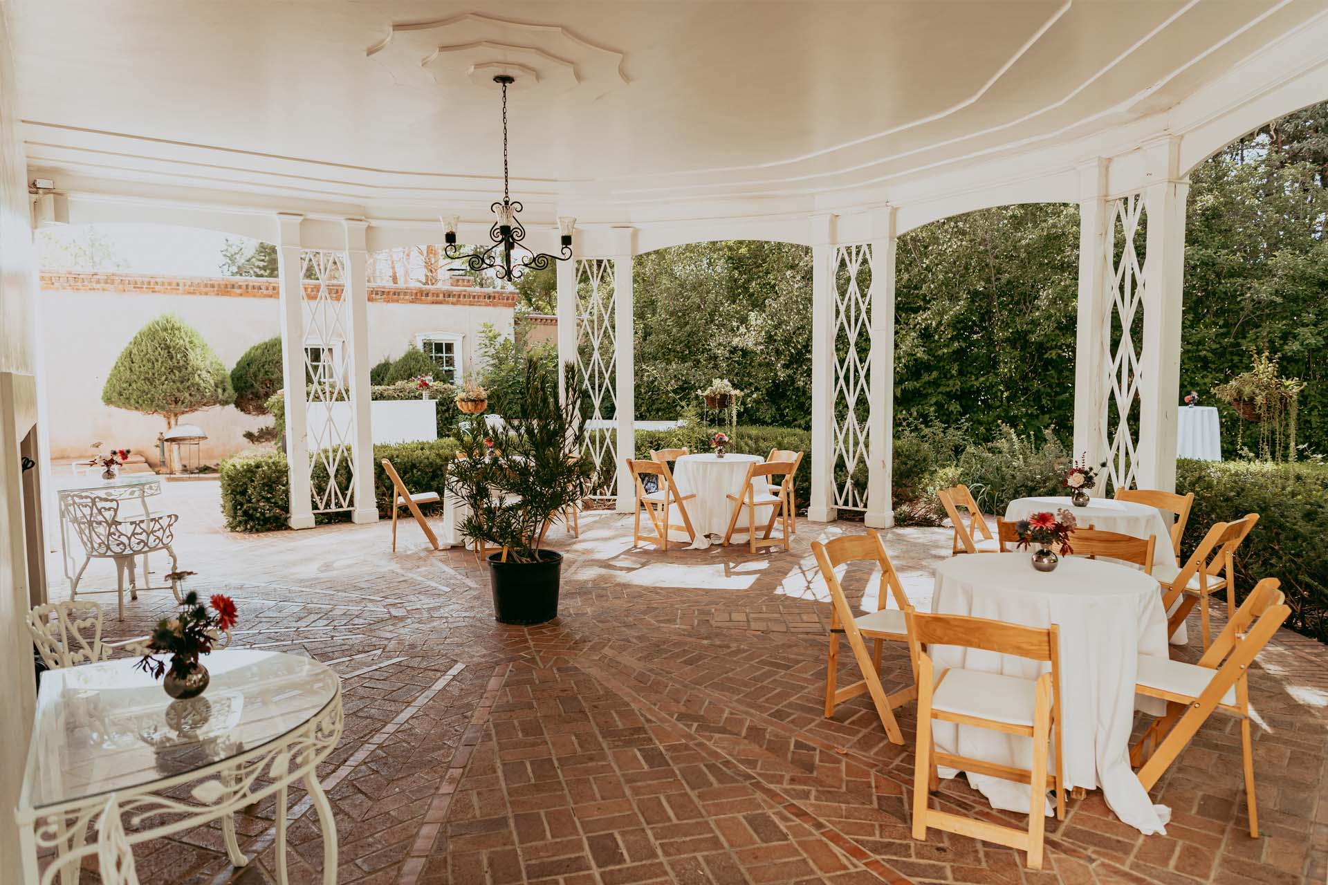 The Gazebo is set behind John Gaw Meem’s architectural masterpiece, La Quinta, and is an ideal space for intimate ceremonies, dining and afternoon teas. Tucked in a lush, secluded garden, this octagonal pavilion is our most private setting and features a dramatic outdoor fireplace and lattice between paired posts.