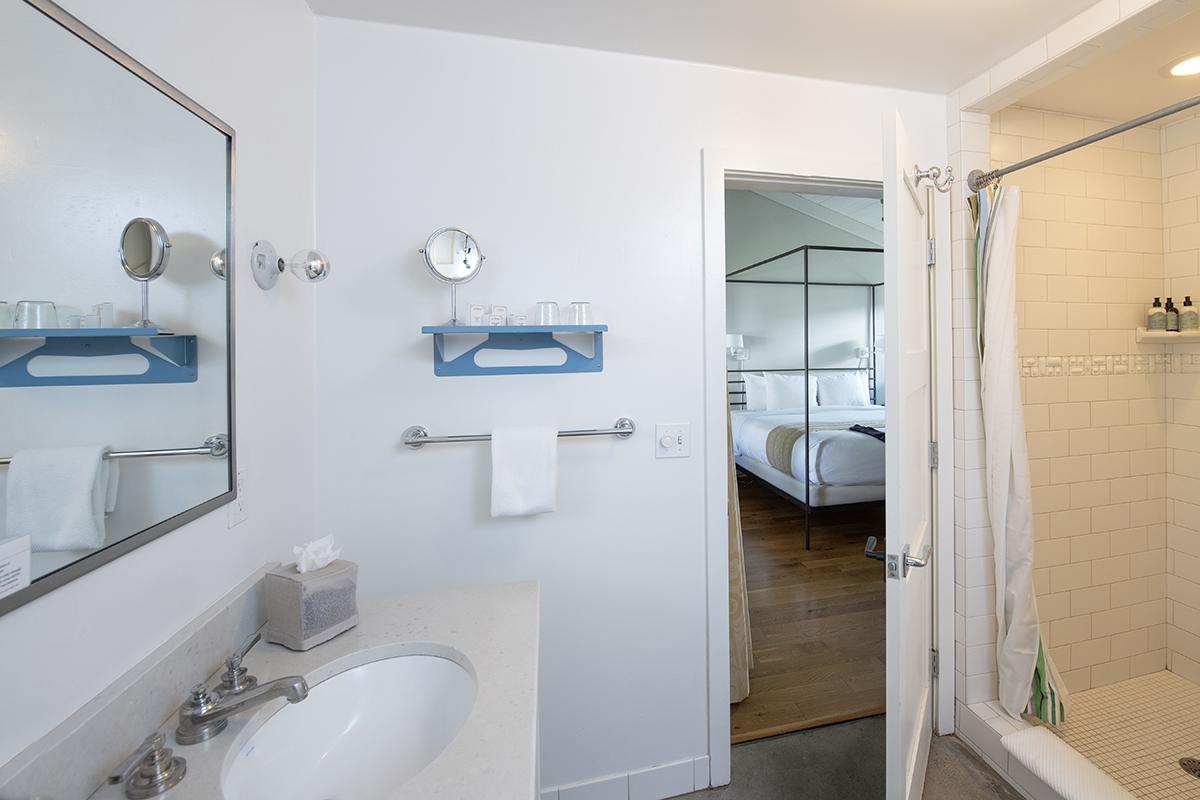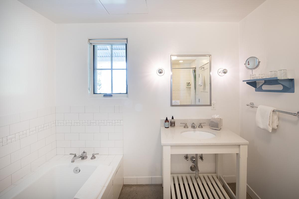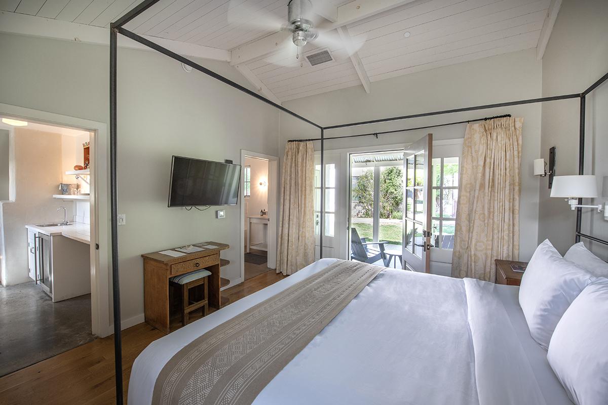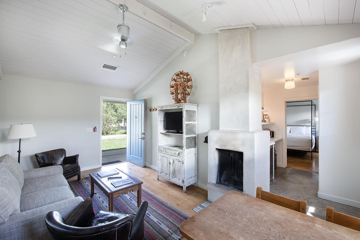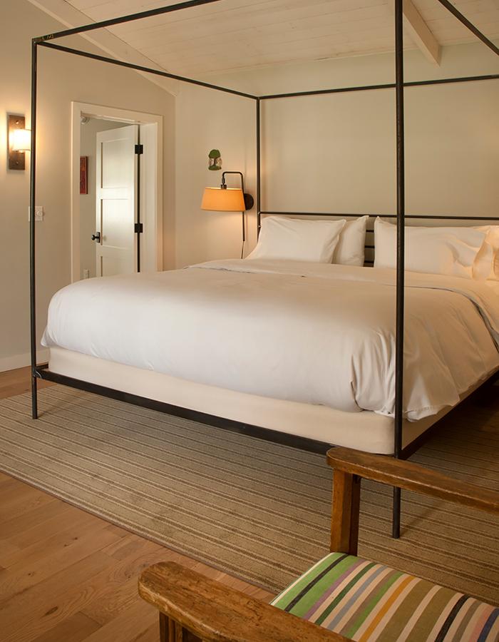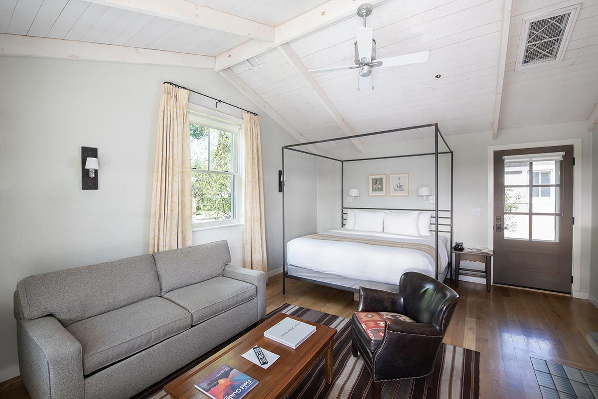 Stay in a spacious room with a steel four-poster king bed, sofa sleeper and a room design that meticulously blends a modern farmhouse and the simplicity of the WPA-era buildings that once dotted the historic ranch. Some rooms offer exclusive outdoor seating in a private patio and all open to a covered portal where you can enjoy a center courtyard with a fountain and views towards the lotus pond. The unique bathrooms offer separate showers and most have soaking tubs.