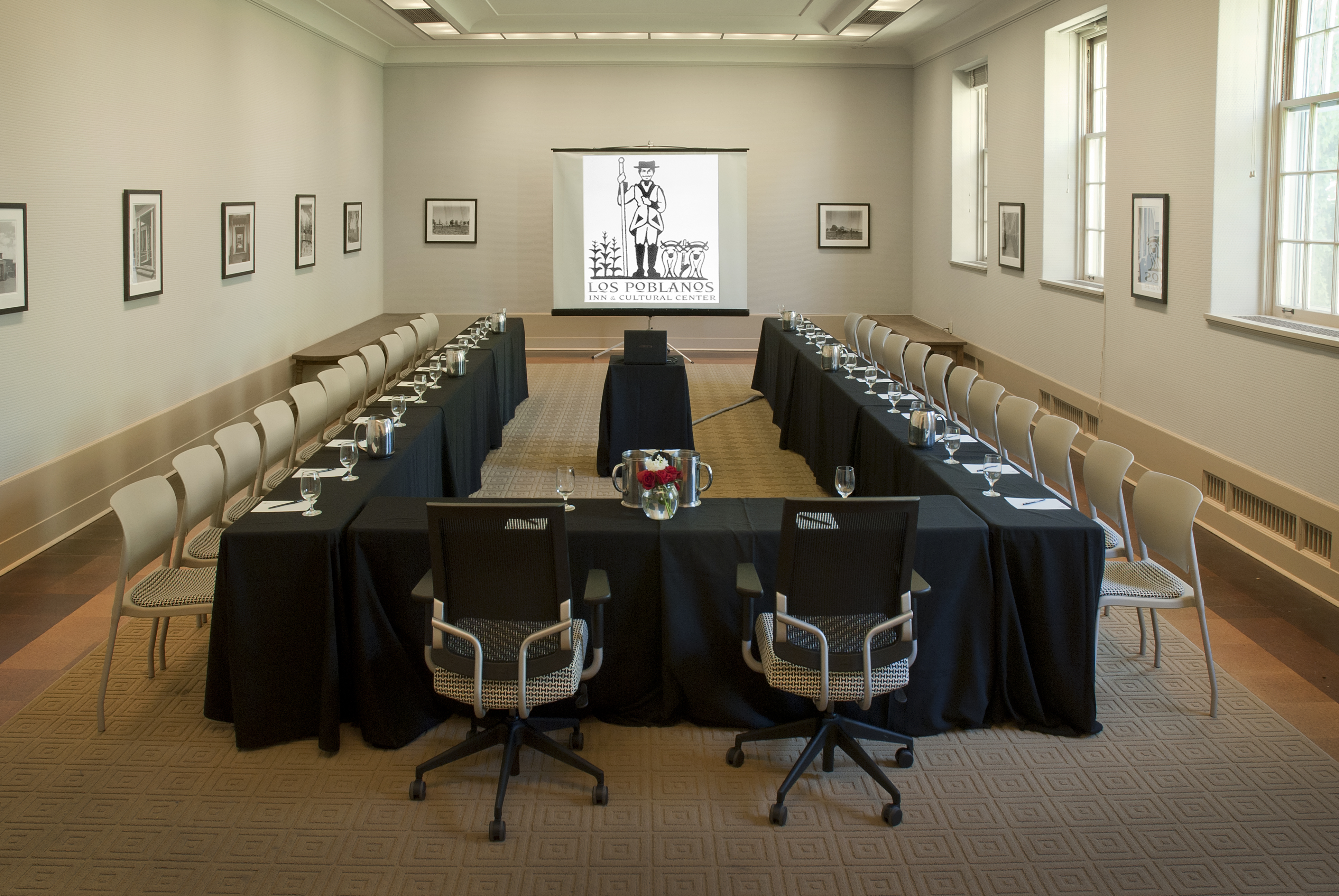 The Barn Commons Meeting Room is a bright and spacious multi-purpose room for up to 16 guests located on the north side of the Los Poblanos property near our pool and fitness room. Rental fees provide access to the meeting room from 8 AM to 5 PM. Additional time can be added between 7 AM and 6 PM for a fee of $500/hour. Discounts are available for non-profit groups and multi-day rentals.