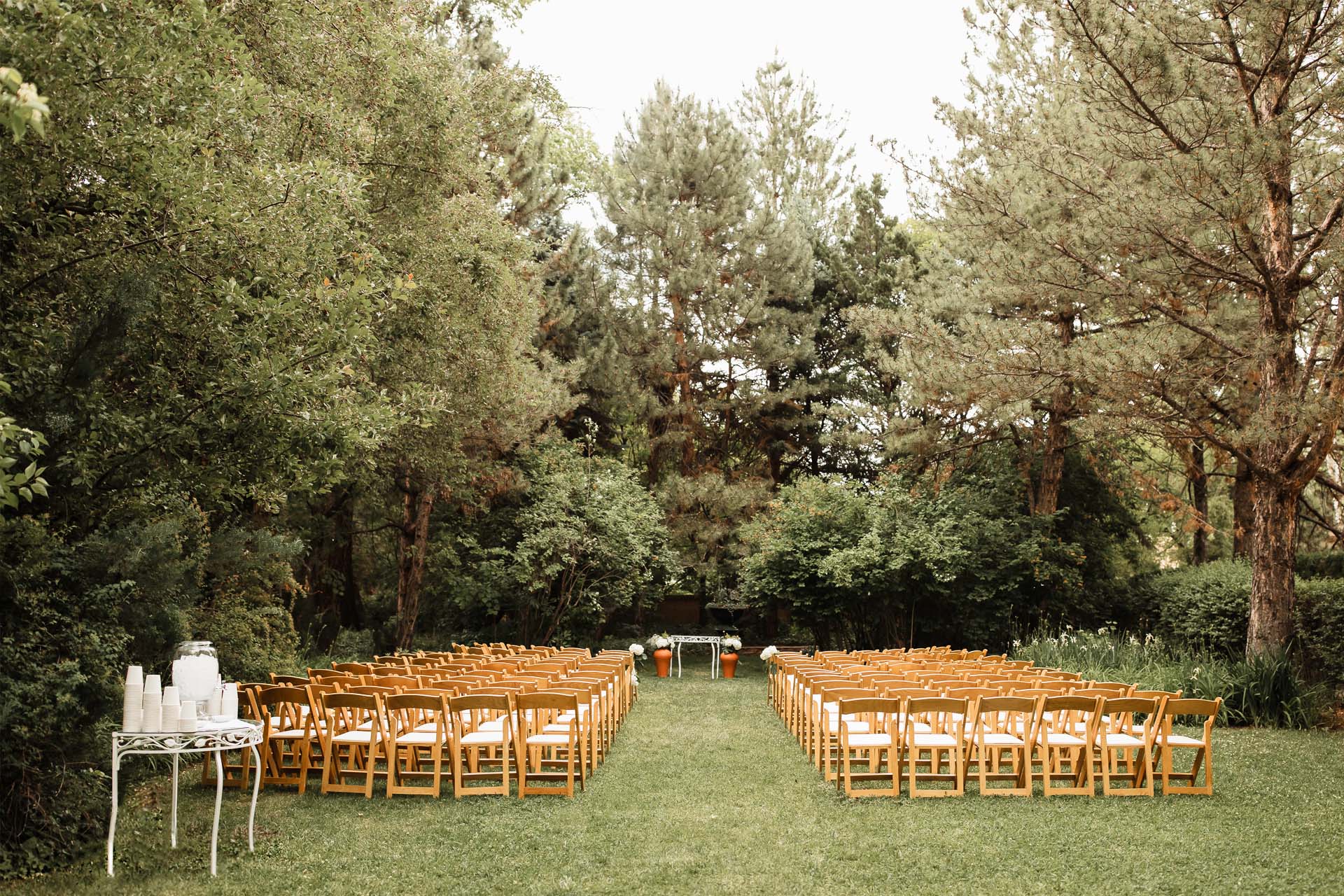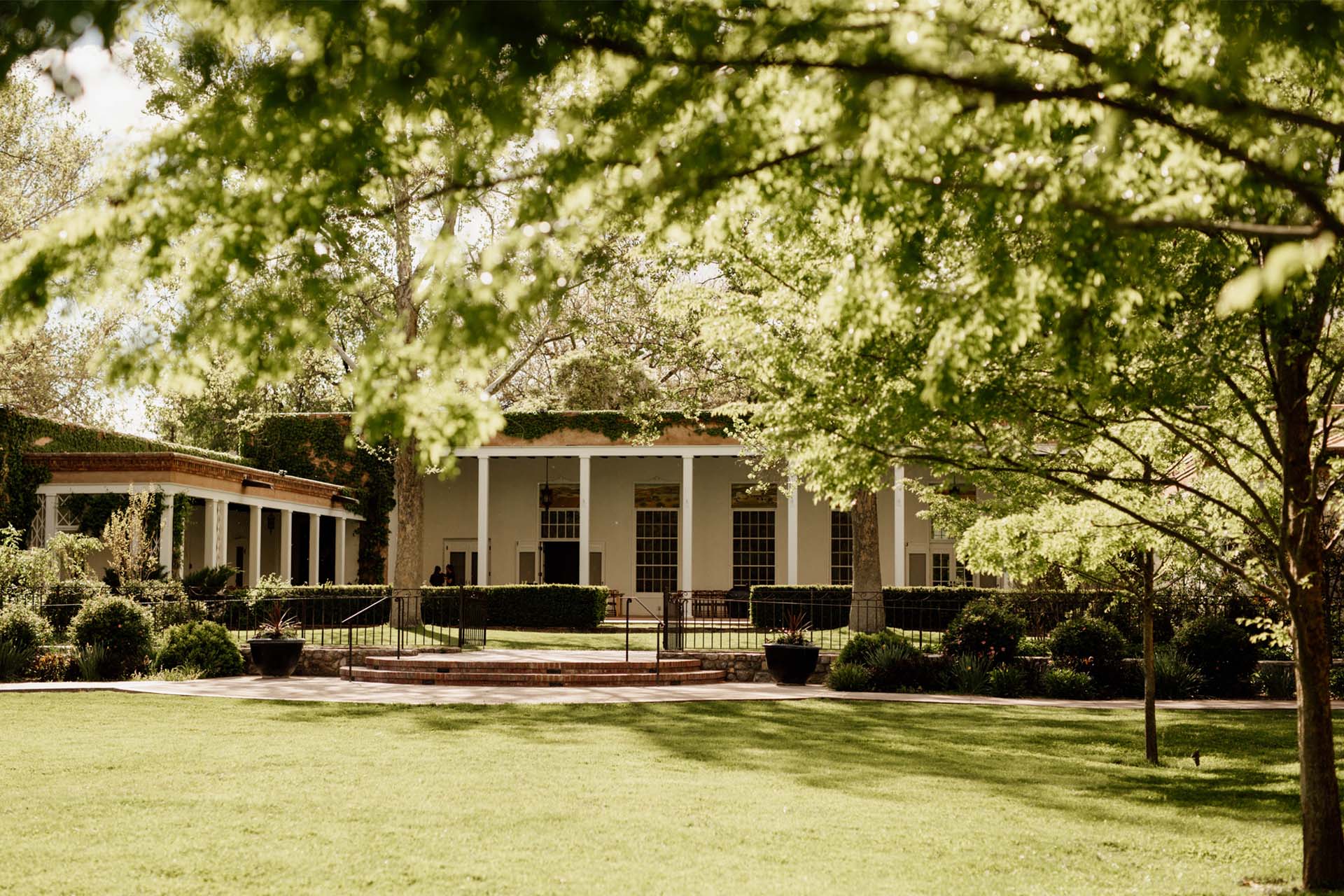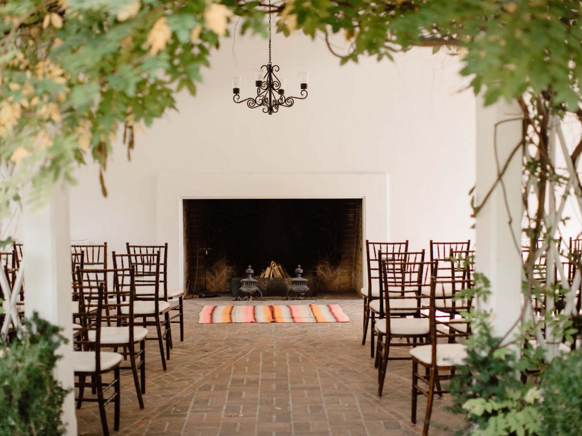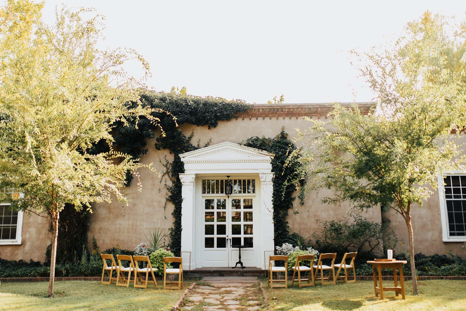 Enveloped by thick hedges and adobe walls, the North Lawn is an intimate, lush area that is perfect for a private ceremony. Striking massive doors framed by creeping ivy and young elm trees provide an elegant backdrop with little need for added decoration.