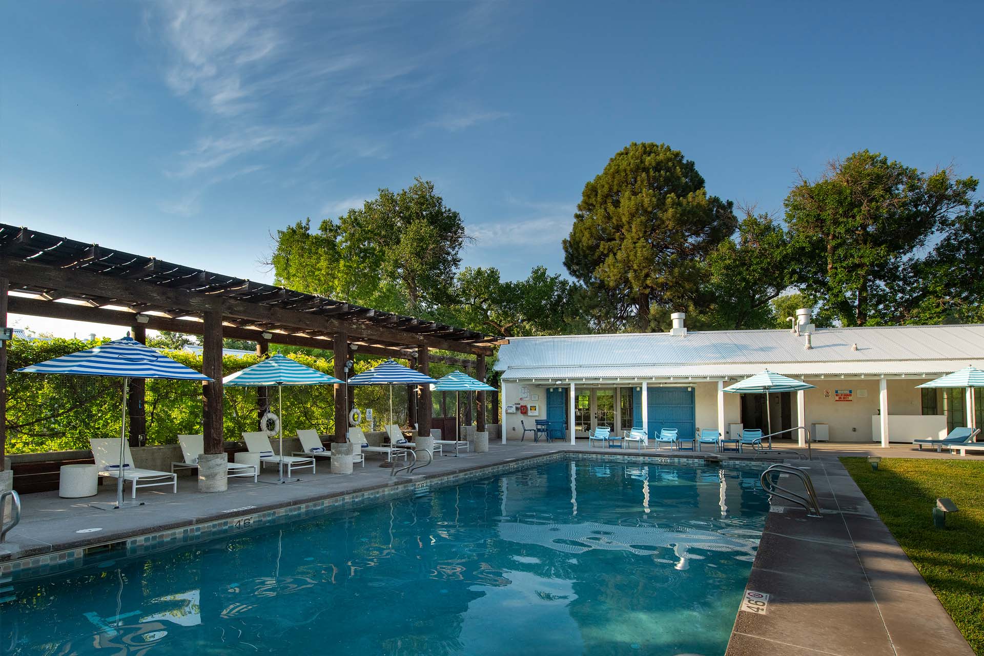 The classical styling, size and grandeur of this space, designed by John Gaw Meem in 1934, creates the perfect setting for outdoor ceremonies and dining. With magnificent views of the Sandia Mountains, the Grand Portal has a twenty foot deep covered portico surrounding a Portuguese tiled swimming pool with fountains. It features a true fresco painted in 1937 by Peter Hurd depicting San Ysidro, the patron saint of farmers, and a series of small mural panels of pastoral farm scenes by Harry Miller.