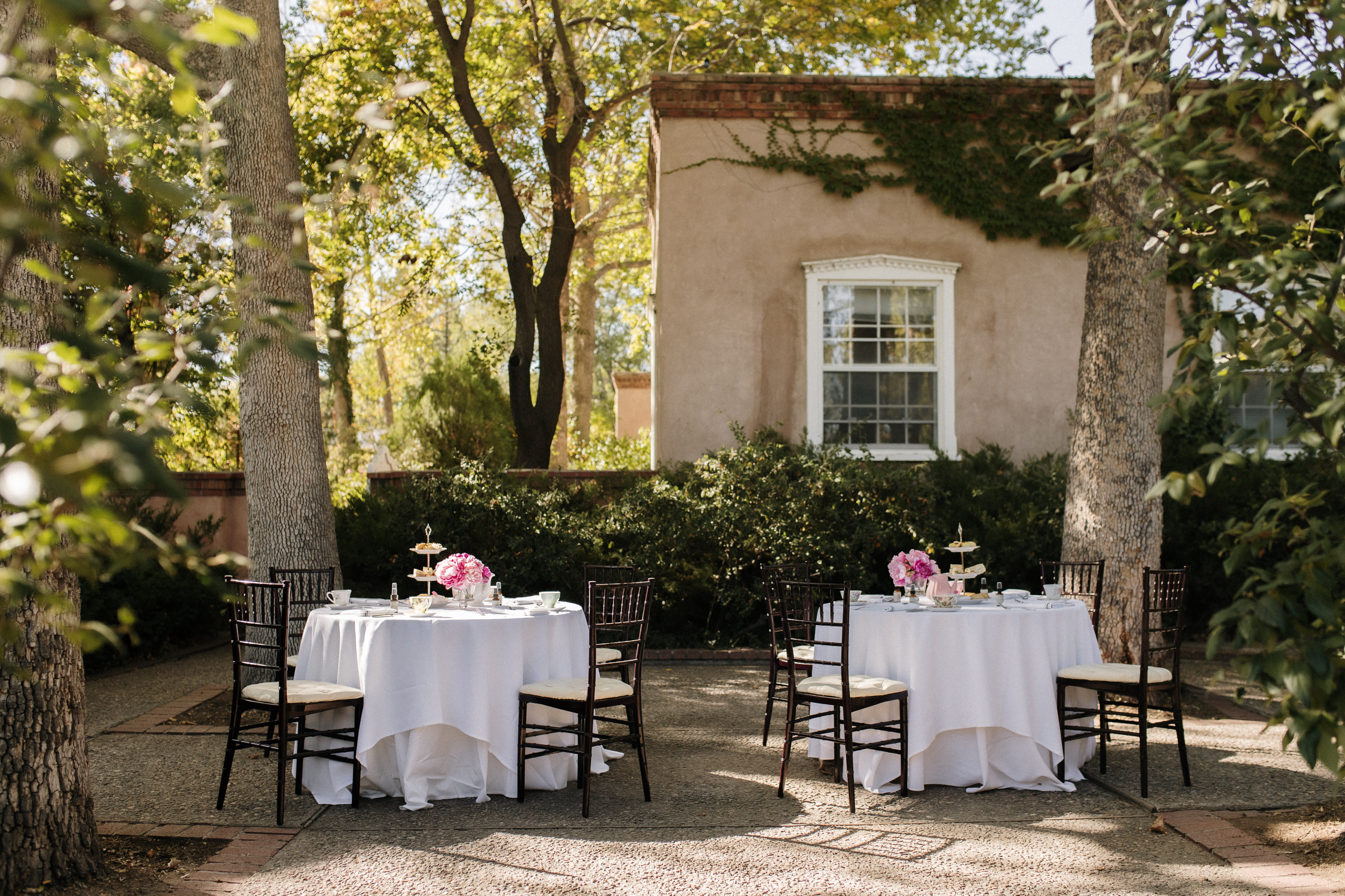 The Gazebo is set behind John Gaw Meem’s architectural masterpiece, La Quinta, and is an ideal space for intimate ceremonies, dining and afternoon teas. Tucked in a lush, secluded garden, this octagonal pavilion is our most private setting and features a dramatic outdoor fireplace and lattice between paired posts.